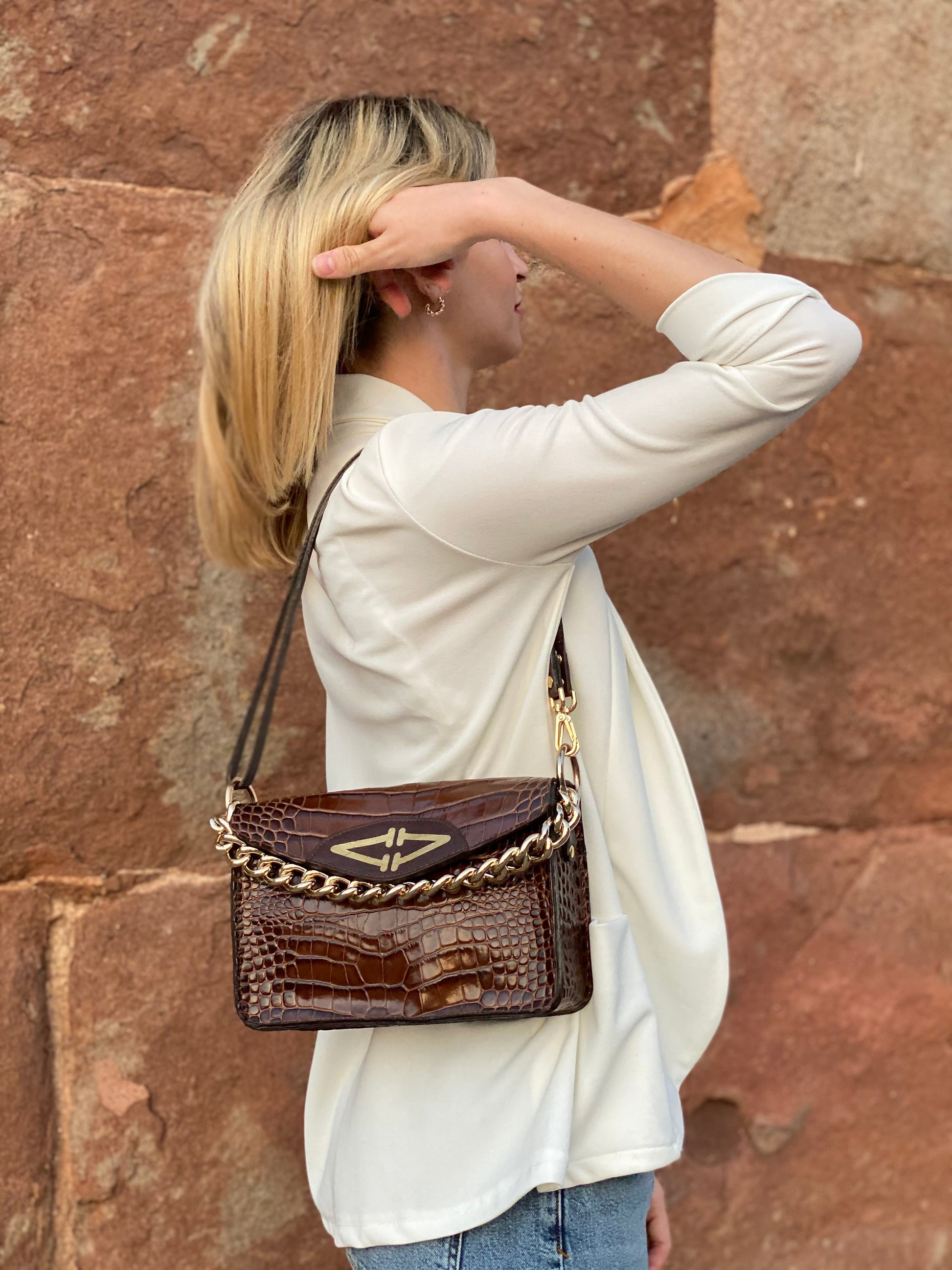 • Modelo compacto con una elegante bandolera ajustable, ideal para tus días activos.